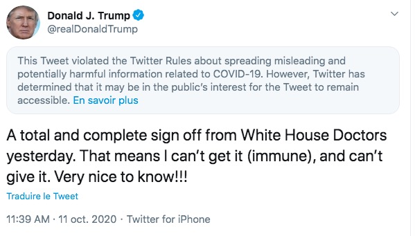 Qui d’autres que lui rabattrait un sujet aussi complexe et tragique qu’une pandémie à un simple combat entre un valeureux héros (lui) et son pitoyable adversaire (Biden). Il se plait maintenant à dire, la traduction est libre : vous avez maintenant un Président qui n’a pas à se cacher dans son sous-sol comme son opposant. Vous avez un Président qui est immunisé.