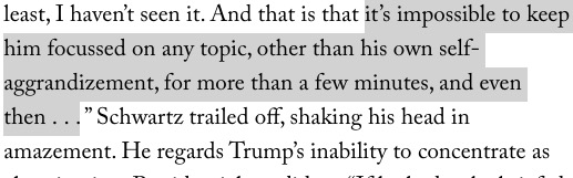 « […] il est impossible de le garder concentré sur quel que sujet que ce soit, sinon son propre auto-encensement, pendant plus de quelques minutes, et encore… »