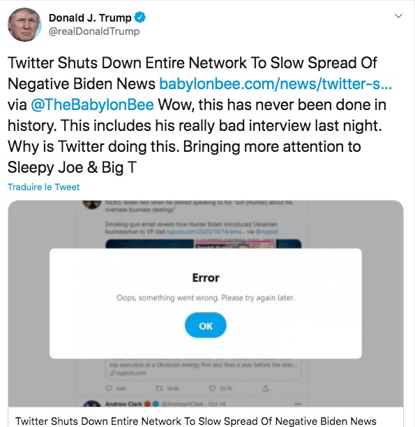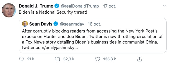 Biden est une menace à la sécurité nationale! [Le tweet original accuse Twitter de corruption pour avoir banni un article du New York Post et un autre de Fox News au sujet de la corruption alléguée des Biden]