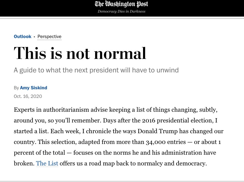 « Les experts en autoritarisme recommandent de garder une liste des choses qui changent, subtilement, autour de vous, afin de vous souvenir. Dans les jours suivant les élections présidentielles de 2016, j’ai commencé à tenir une liste. Chaque semaine, j’ai consigné les manières avec lesquelles Donald Trump a changé notre pays. Cette sélection, une adaptation à partir de plus de 34 000 entrées – ou 1% du contenu total – s’intéresse aux normes que lui et son administration ont brisées. La liste nous propose un itinéraire vers le retour à la normalité et la démocratie »