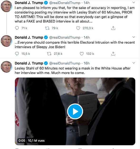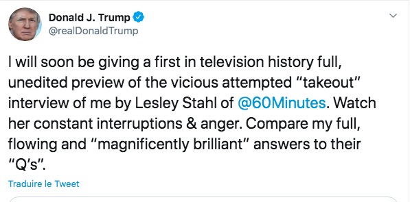 Monsieur le président avait préparé tout le monde à un spectacle de son cru: après avoir mis abruptement fin à l’entrevue, il s’était immédiatement tourné vers Twitter pour mousser l’idée qu’il avait encore une fois été injustement traité par les « fake news », mais qu’il avait remis la monnaie de sa pièce à l’intervieweuse.
