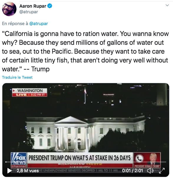 La Californie devra rationer l’eau. Voulez-vous savoir pourquoi? Parce qu’ils envoient des millions de gallons d’eau à la mer, dans le Pacifique. Parce qu’ils veulent prendre soin de certains tout petits poissons qui ne vont pas très bien sans eau