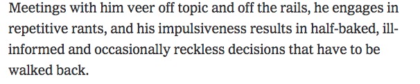 Les réunions avec lui s’écartent du sujet et déraillent, il se lance dans des tirades répétitives et son impulsivité l’amène à prendre des décisions bancales, mal informées et parfois téméraires qu’il faut ensuite réparer